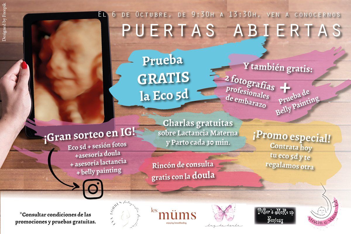 (Servicios para contratar el día del evento y para realizar otro día con cita previa)**Para participar en el SORTEO será necesario seguir los perfiles en instagram de @vinemaveurehd, @lesmümslactancia, @evatorres_fotografia, @vigarsmakeupfantasy y @luzdedoula, dar "Me gusta" a la publicación del sorteo en el perfil de @vinemaveurehd, y comentar en esa publicación diciendo qué día será la Jornada de Puertas Abiertas y mencionando a una embarazada (tantas veces como se quiera pero sin repetir la embarazada) hasta el día de la Jornada de Puertas Abiertas 06/10/19 a las 23:59h. El sorteo se realizará el 07/10/19 y se comunicará a través de nuestras redes sociales, y por teléfono a la ganadora. Premio: una ecografía Basic 5D + una sesión de fotos de embarazo con Eva Torres en Mataró con 2 cambios de ropa y 5 fotos retocadas + una sesión de Belly Painting sencilla (30min) con Vigars Make Up Fantasy + Asesoría privada con Luz de Doula de 45min en Mataró + Consulta de lactancia a domicilio de 30min en Mataró o alrederores (10km) de L a V. Premios intransferibles y no canjeables por su valor económico.